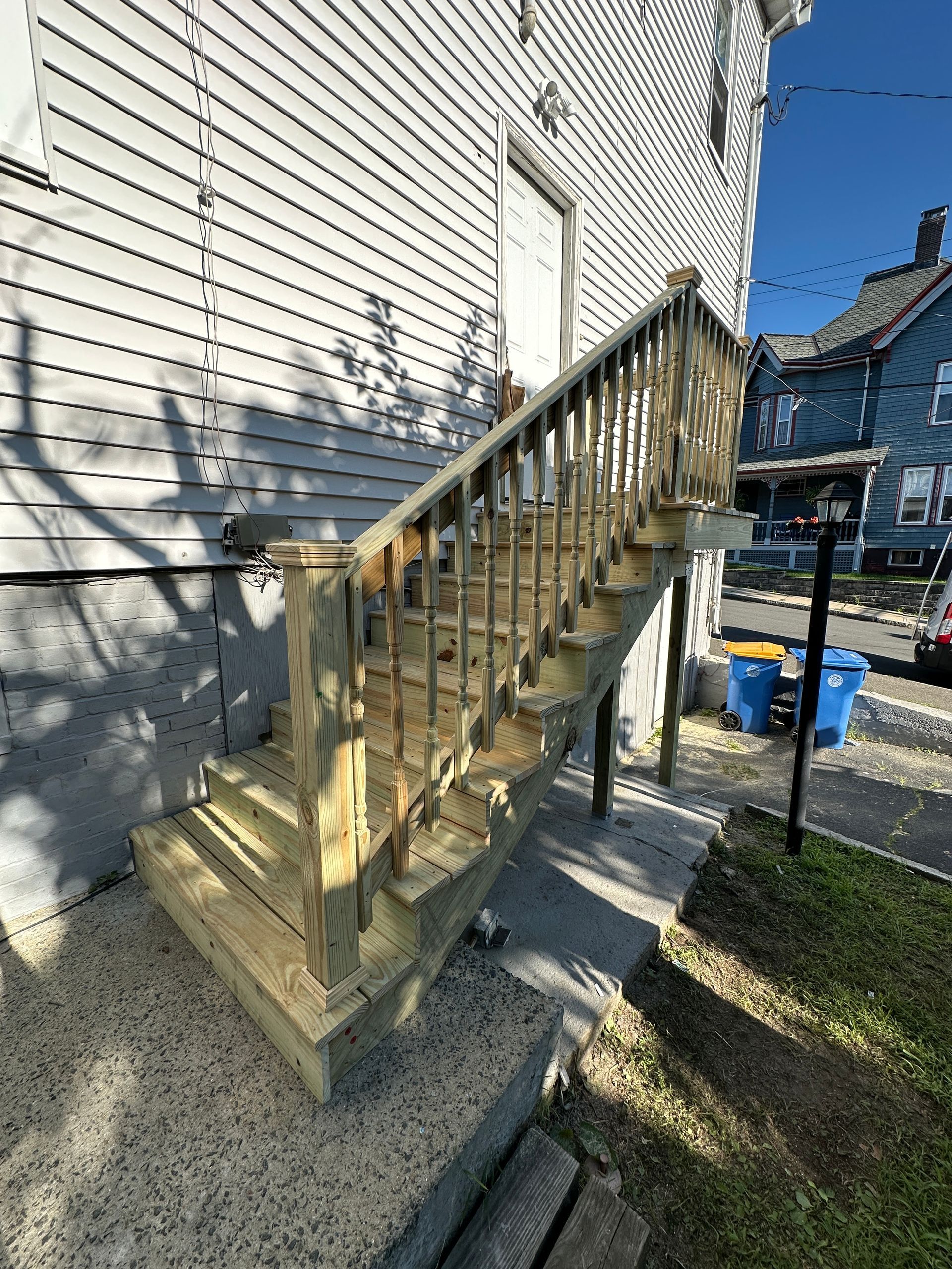 The new staircase was framed and finished with pressure-treated lumber, helping resist rot and moisture damage in New England weather. The design intentionally stayed minimal to respect the original look of the property, while new posts, railings, and treads were fully reinforced for stability and code-compliant use.
